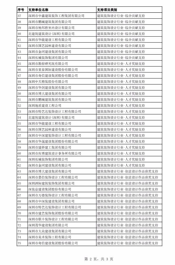 核心提示:2018年10月22日,福田企服中心公布了2018年福田區(qū)產(chǎn)業(yè)發(fā)展專項(xiàng)資金文化產(chǎn)業(yè)分項(xiàng)第二批支持企業(yè)及項(xiàng)目匯總表。其中,深圳市奇信建設(shè)集團(tuán)股份有限公司、深圳市博大建設(shè)集團(tuán)有限公司、深圳市美術(shù)裝飾工程有限公司等建筑裝飾企業(yè)獲得該項(xiàng)專項(xiàng)資金支持。支持項(xiàng)目類別有建筑裝飾設(shè)計(jì)行業(yè)——綜合貢獻(xiàn)支持、人才獎(jiǎng)勵(lì)支持、創(chuàng)意設(shè)計(jì)作品獲獎(jiǎng)支持、企業(yè)資質(zhì)認(rèn)定支持。