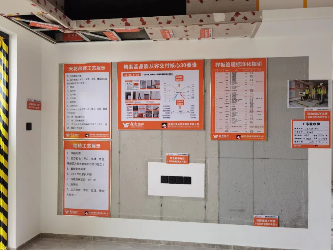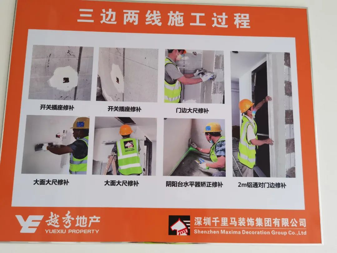 該項目重難點主要體現在以下幾個方面:1、衛(wèi)生間和陽臺地面瓷磚采用濕貼鋪法,能有效地防止?jié)B漏隱患,項目部針對瓷磚濕貼對工人進行了專門的技術交底,嚴格按照工序與質量要求進行施工。2、三邊兩線工藝,在涂料施工前嚴格按照三邊兩線工藝,門窗邊、柜體邊、開關面板線盒邊、門套線、踢腳線先進行膩子找平施工完成驗收后再開始大面膩子施工;按照甲方高標準要求,本項目開關面板及門套線在乳膠漆完成面漆后再安裝,保留自然縫,呈現較好的觀感質量。3、空調風口百葉采用細邊框,項目部與甲方進行技術溝通,優(yōu)化了空調百葉的安裝方式,視覺上隱藏了螺絲,大大提升了觀感質量,最終得到越秀地產集團的一致好評和認可。
