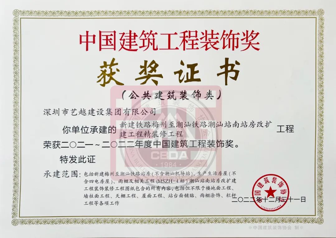 近日,備受關注的中國建筑裝飾獎揭曉,由藝越建設承建的新建鐵路梅州至潮汕鐵路潮汕站南站房改擴建工程、潮汕站南站房改擴建工程幕墻工程、坪山區第二實驗學校施工總承包幕墻裝飾工程,榮獲建筑裝飾行業最高榮譽獎項——中國建筑工程裝飾獎,為我司榮譽墻再添新勛章!