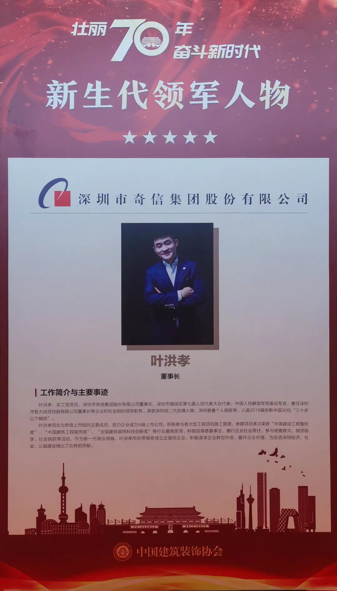 2019年11月28日-29日,第四屆全國(guó)建筑裝飾行業(yè)科技創(chuàng)新大會(huì)暨大國(guó)裝飾70年輝煌成就展在青島國(guó)際會(huì)議中心隆重召開。會(huì)上,深圳市奇信建設(shè)集團(tuán)股份有限公司(以下稱“奇信股份”)被授予“科技創(chuàng)新企業(yè)”稱號(hào),其承建的項(xiàng)目北京雁棲湖國(guó)際會(huì)展中心獲得“70周年百項(xiàng)經(jīng)典工程”稱號(hào),奇信股份董事長(zhǎng)葉洪孝榮獲“新生代領(lǐng)軍人物“稱號(hào)。