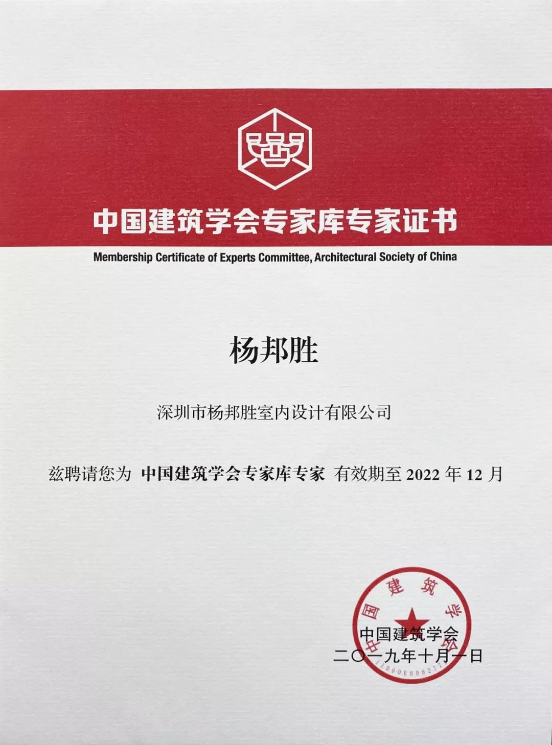 ▲ 中國建筑學會專家庫專家證書