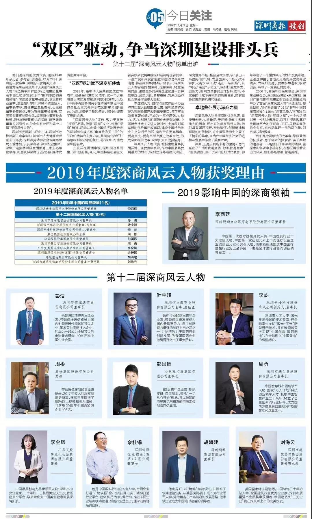 據悉,“深商風云人物”評選評選活動創辦于2006年,旨在宣傳“深商”品牌,傳播“深商”文化,傳承“深商”精神?;顒右詣撛熘袊洕l展奇跡的深圳商業模式和“事事敢為天下先”的“深商”精神為主要內容,共同將“深商”打造成深圳企業家的象征,將“深商”打造成深圳的名片。 按照創新力、質量觀、責任感、推動力和影響力的標準,最終有十位企業家通過評審,成功入選本屆“深商風云人物”榜單。