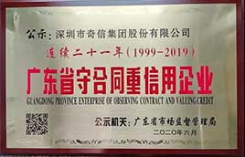 奇信股份:連續21年榮獲廣東省“守合同重信用”企業稱號