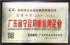 大眾建設:連續(xù)十年榮獲廣東省“守合同重信用”企業(yè)