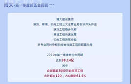 4月21日,深圳市博大建設集團有限公司(以下稱“博大建設集團”)發布消息稱,2021年一季度公司新簽合同額達38.14億元,范圍涵蓋裝飾、幕墻、機電工程等多個板塊,其中,合同額超5000萬的單項工程合計超過12億,占總量的31.5%。