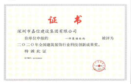 嘉信建設:科研成果“一種幕墻結構”榮獲“2020年全國建筑裝飾行業科技創新成果獎”