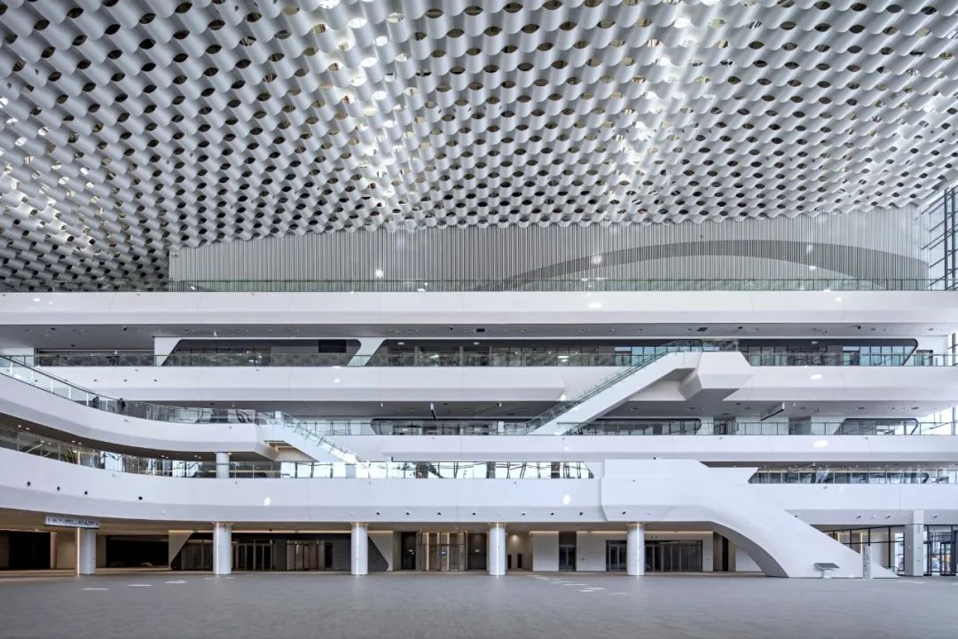 走進門廳,一股簡潔明快、清新大方的現代之風撲面而來。站在高大寬闊的大廳前,人顯得如此渺小。放眼望去,無論是那充滿海浪流動感的四層樓裙,還是那連綿起伏、波瀾涌動的波浪形吊頂,亦或是那鑲嵌在波浪之中宛如明珠般的點點燈光,都讓人有一種身臨浩瀚大海之感。主登錄廳也是整個會展中心最具特色、最核心、最重要的區域之一。