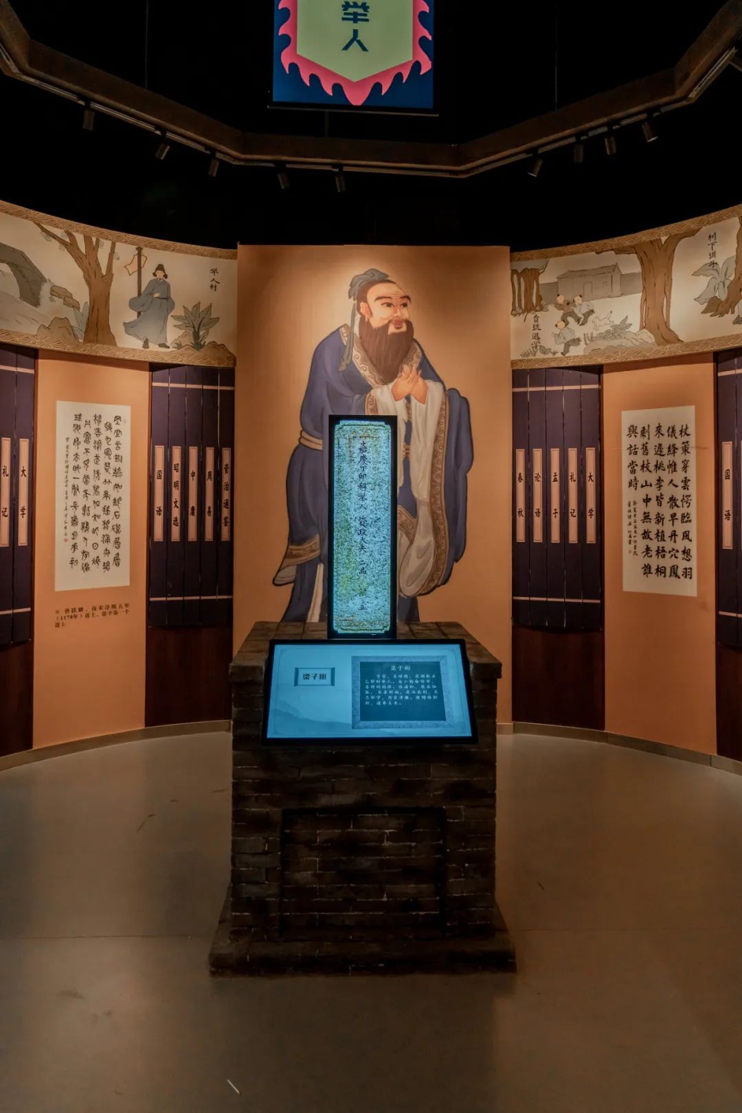 該展區主要陳列展示恩平教育發展歷史成果以及古代的官吏名人。步入文教興盛單元,歷史遺存的匾額赫然入目,兩根筆筒形狀的立柱鐫刻歇馬村祖訓,兩側圖文展板結合書院牌匾和歷史文物,展示古代恩平的著名書院,以及對文教興盛和文化傳承的高度重視。弧形中心設置歇馬村標志性旗桿,上方設計多媒體顯示屏,循環播放歇馬村八大旗桿內容,頂端設計玉斗,寓意才高八斗。旗桿后方懸掛孔子畫像,背景設計為弧形書架,寓意歇馬村崇文重教的風尚。書架上方的弧形墻面,設計古代科舉過程,采用環形畫的方式,再現古代學子登科的過程,使參觀者了解古代考取功名的艱辛歷程。歷史先賢部分,以獨立空間展示恩平先賢,中間設計梁元桂雕像,兩側采用圖文、人物造型等手段,展示其生平介紹等內容,頂部采用歇馬村勵學制為原型進行藝術設計,再現先賢生平,與整個展區相互呼應。