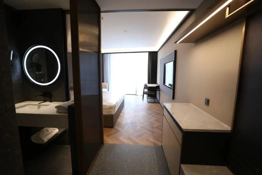 該項(xiàng)目由中建科工及同濟(jì)大學(xué)建筑設(shè)計(jì)研究院以EPC模式承建,采用工廠化生產(chǎn)、裝配式施工、一體化裝修的鋼結(jié)構(gòu)體系。千里馬裝飾集團(tuán)負(fù)責(zé)南樓1-3層及北樓10-21層區(qū)域的精裝修工程中所有樓地面、踢腳線、墻面、收口線、天棚吊頂(風(fēng)口百葉)、隔墻(戶(hù)內(nèi)外圍隔墻、分戶(hù)隔墻、門(mén)洞處隔墻、門(mén)洞上方隔墻、戶(hù)內(nèi)風(fēng)井包管、戶(hù)內(nèi)包柱隔墻門(mén)窗、管井處隔墻)隔斷(門(mén)窗基層、衛(wèi)生間及門(mén)套、入戶(hù)門(mén))、裝飾線條、防火巖棉及燈槽、全身鏡、固定衣柜、窗簾盒等,圖紙顯示配套配電箱末端強(qiáng)電安裝工程(燈具、開(kāi)關(guān)插座、管線敷設(shè))、從預(yù)留給水三通(含接駁)接至用水器具的管道、給水器具和排水器具的施工,施工范圍內(nèi)與其他單位交界的收邊收口等一切所需工作以及范圍內(nèi)門(mén)窗工程。由于工期緊張,項(xiàng)目自6月初進(jìn)場(chǎng)以來(lái),克服了疫情、雨季、高溫以及高空作業(yè)、工期緊等諸多困難,用3個(gè)月實(shí)現(xiàn)南樓交付,5個(gè)月實(shí)現(xiàn)全面交付。