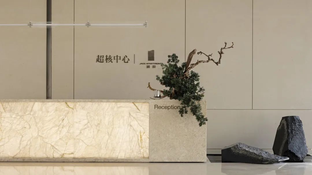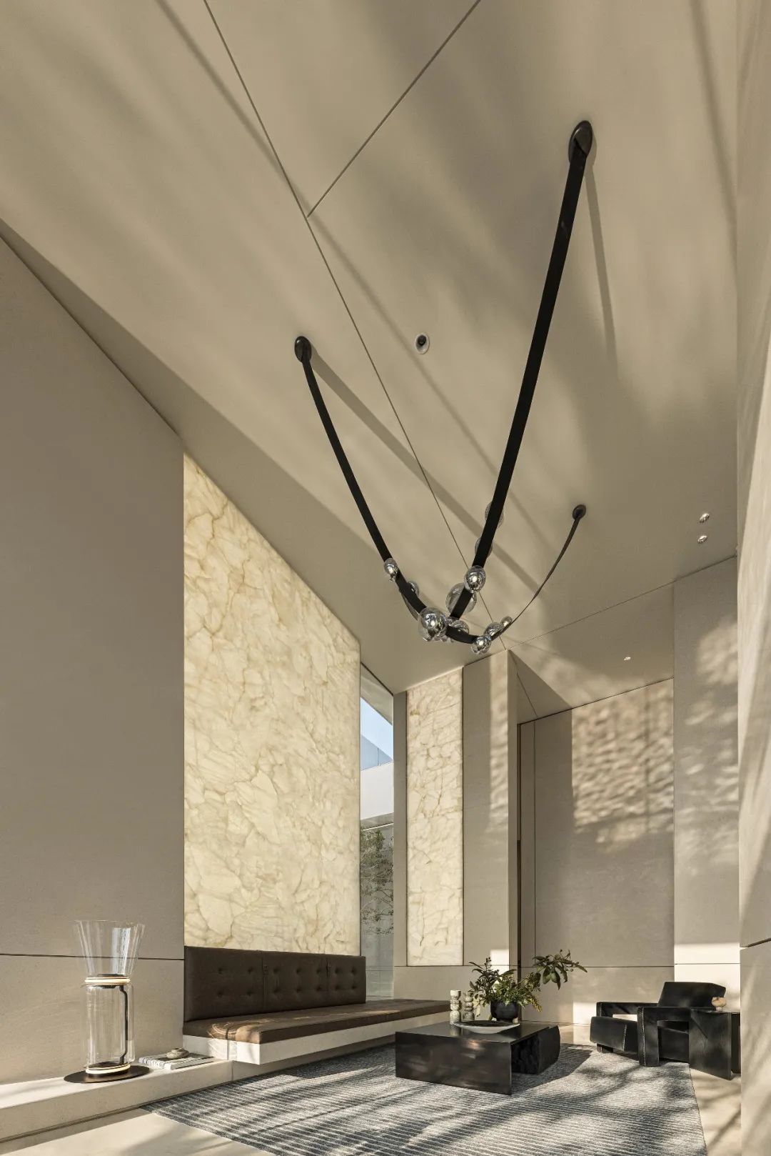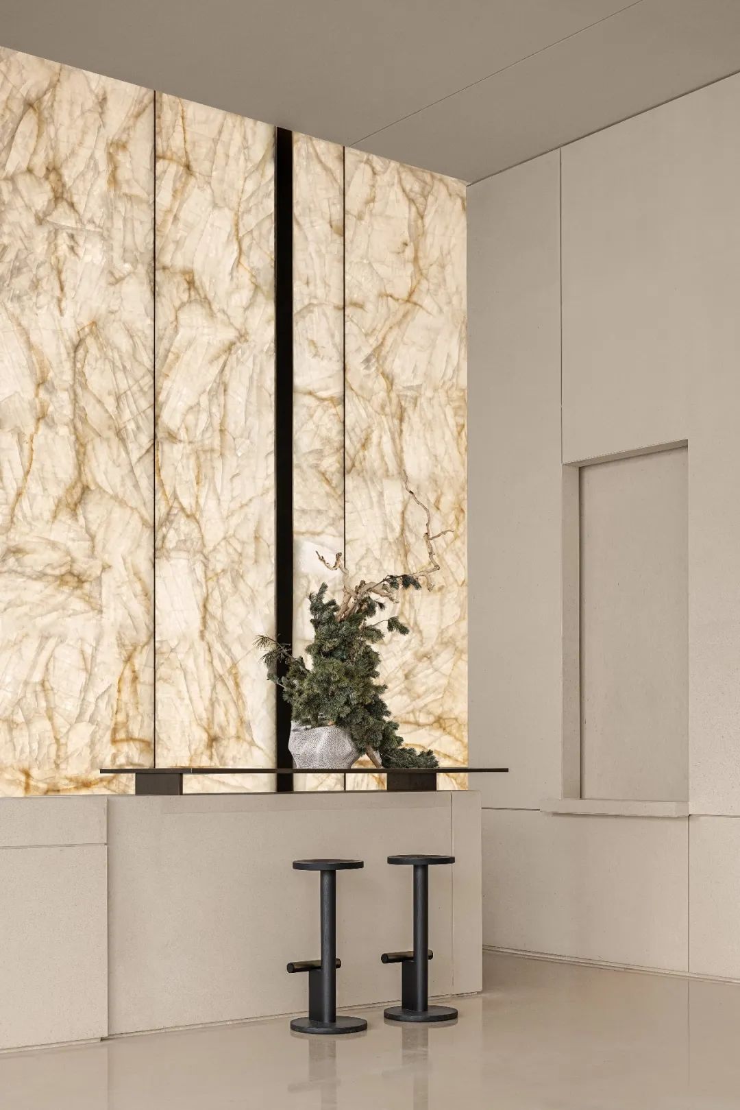 水吧是由擁有潤澤質感的透光玉石進行構築的高敞空間。關於玉石,山給予它軀體,水給予它形態,是山水的另一面演繹,也是極致的鋼韌與極致的柔軟相遇而孕育的產物。落進現代都市的空間中,光輝給予了它一份獨屬於現代的璀璨。