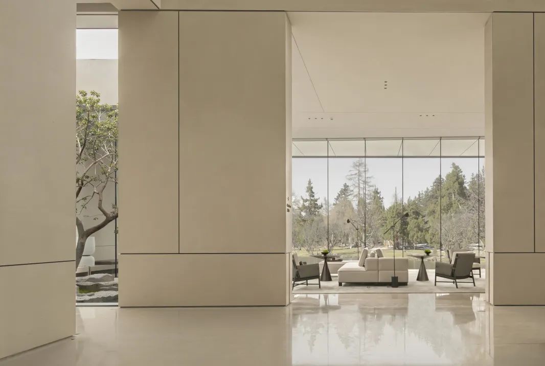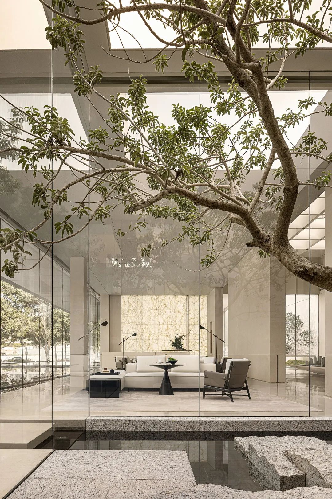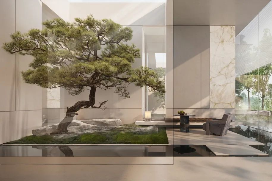 而作為東方建築美學代表之一的蘇州園林,則為空間的內部提供了有關人與自然和諧共生的別樣色彩。山水意象的組合在東方文化中有著極大的佔比,流動的水給予人柔軟清涼的觸感,枝幹鮮明的樹則打造了堅韌的自由形態,剛柔並濟,陰陽調和,和諧表面下映射的是東方古典的高情遠韻。