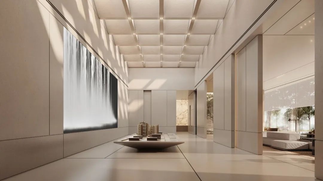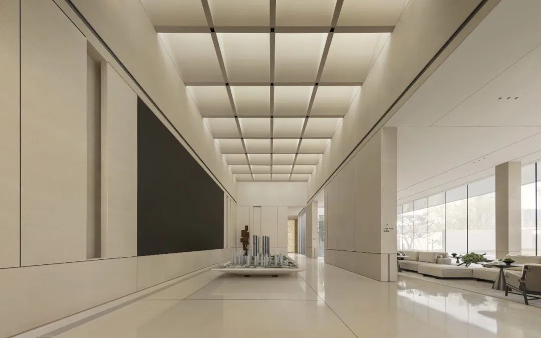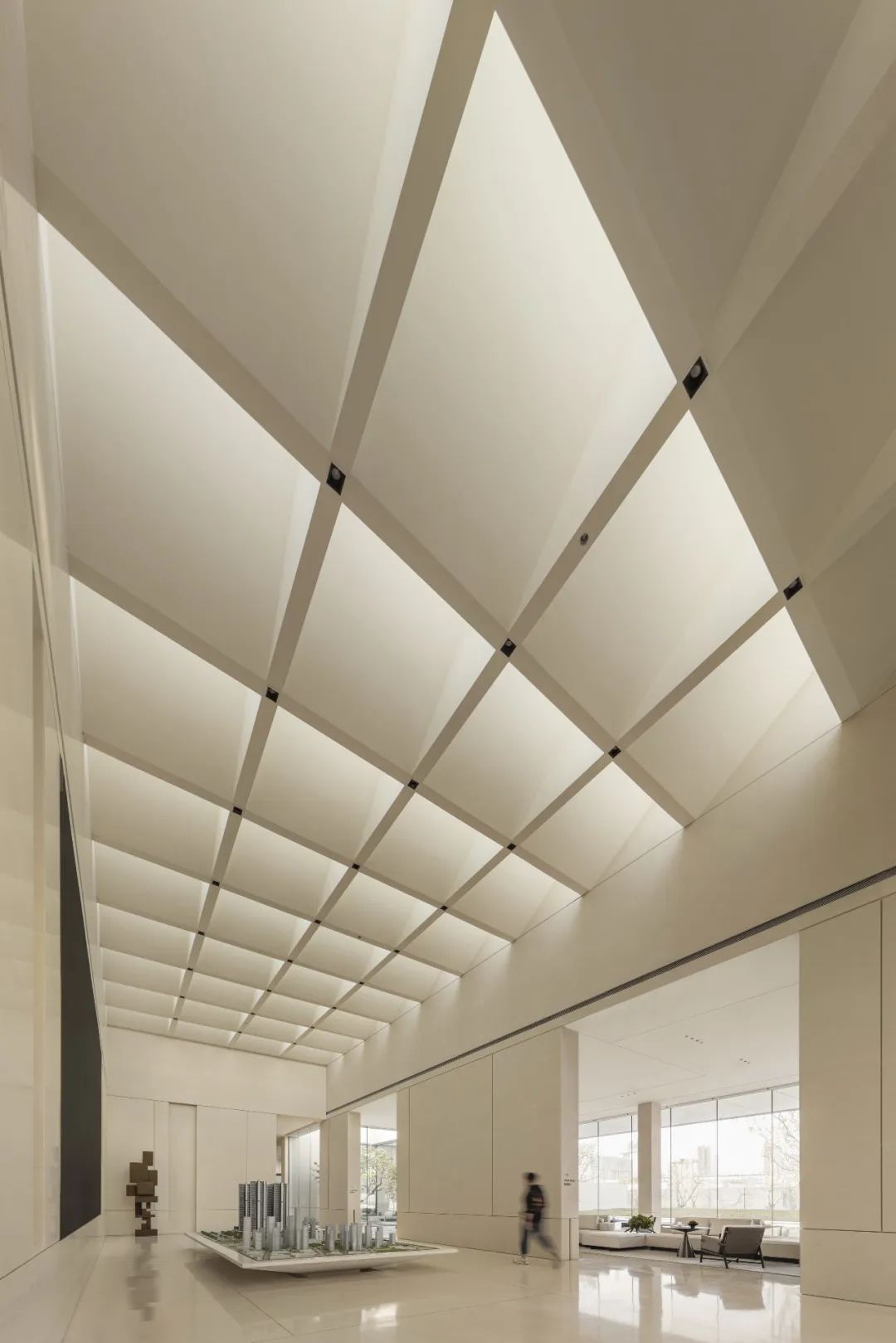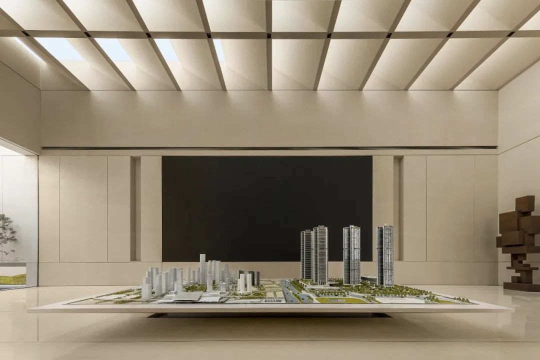 模型區天花一反原始嚴整斬齊的封頂構築,通過結構重塑與角度調整,打造大型橫斷格柵,使太陽顯現出別樣的形態,實現日光在室內的自然傾瀉與光影變幻。