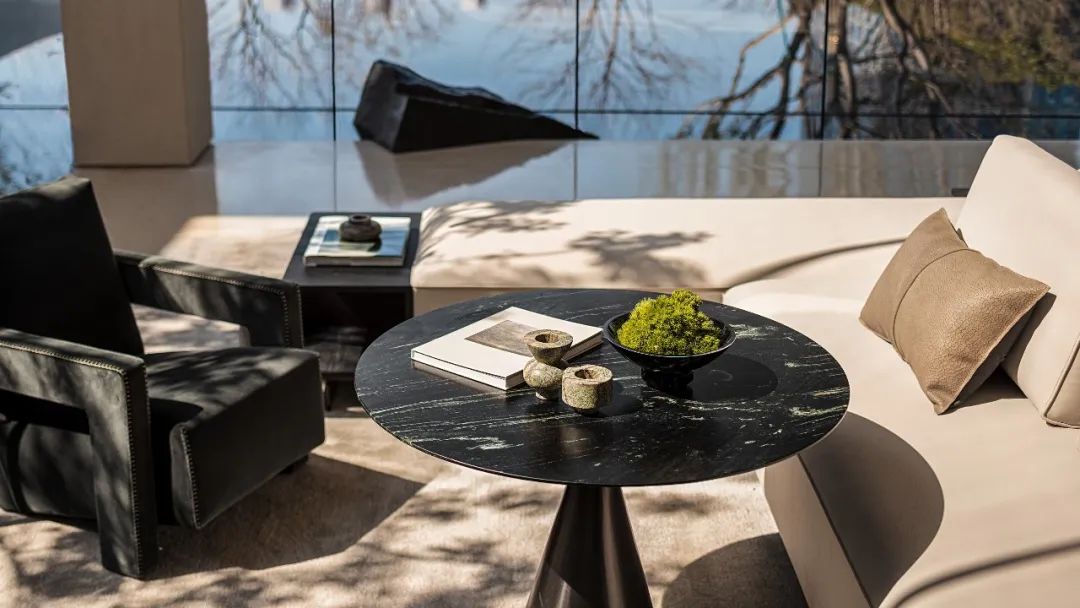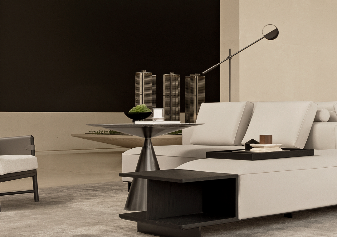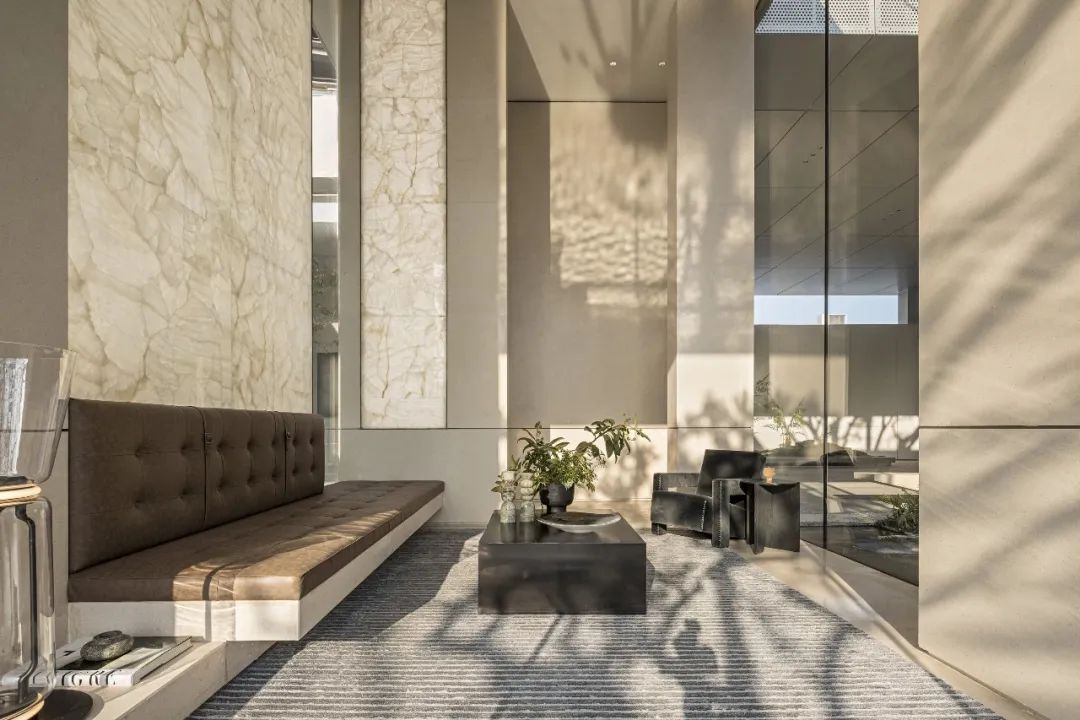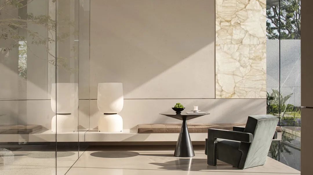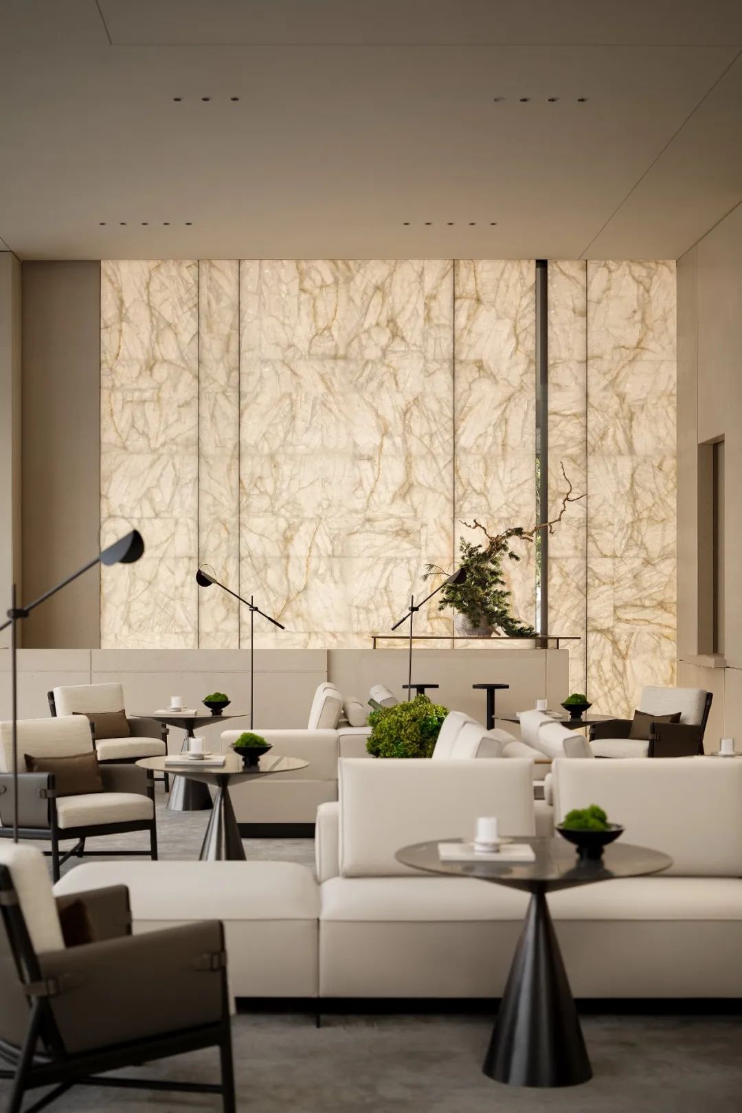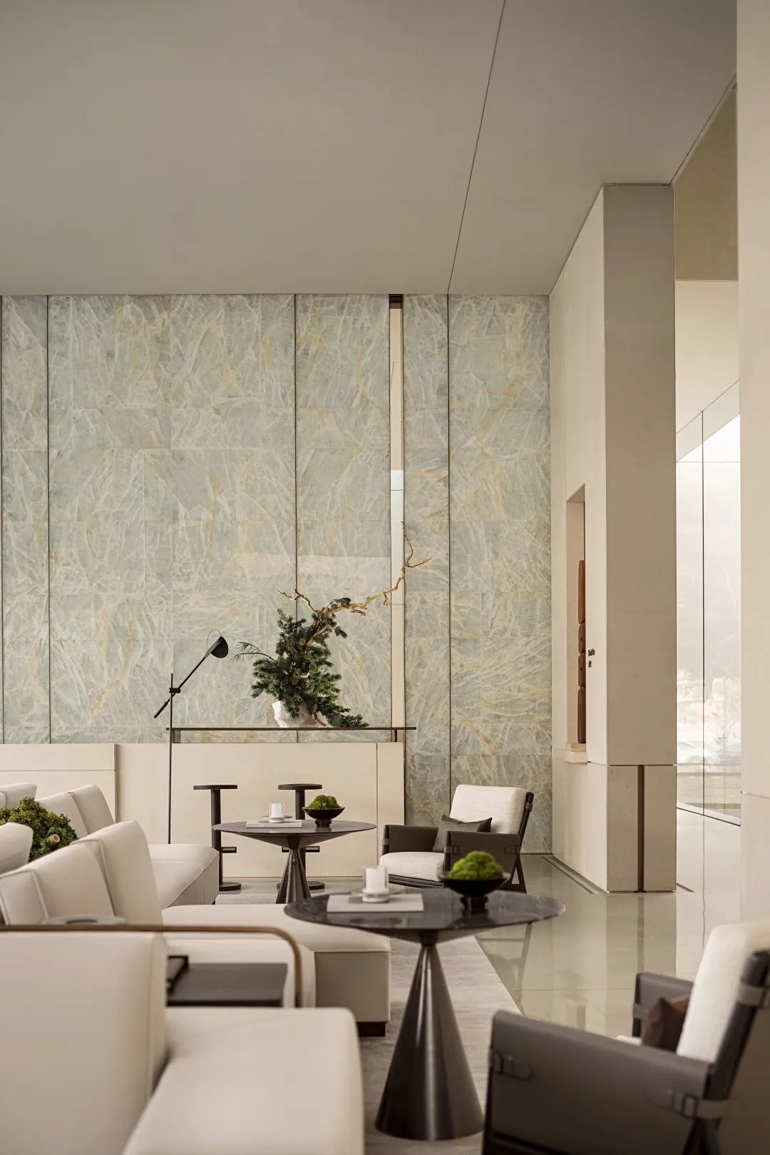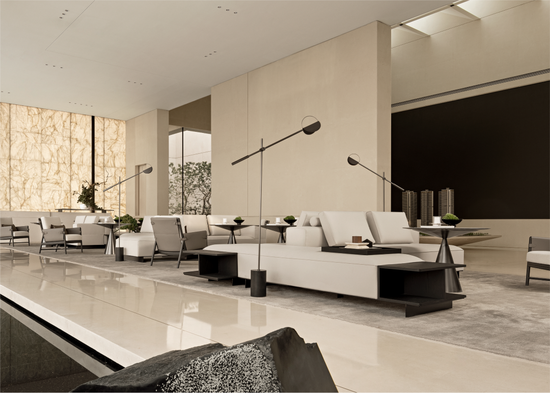 洽談區的布藝沙發選用來自意大利輕奢品牌VALENTINI的產品,祛除繁瑣的配飾與構造,而是使用素雅的配色與基礎的形狀營建簡單自然的氣氛,配合具有自然紋理的淡雅石面雅緻天趣渾然而生。