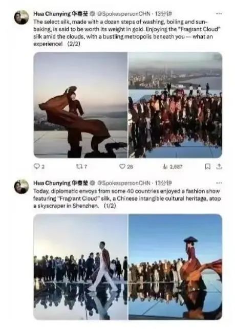 2024年1月4號(hào)“外交官看中國(guó)?廣東行”活動(dòng)一行來到廣東省深圳市,近40個(gè)國(guó)家的駐華使節(jié)走進(jìn)前海合作區(qū),了解深港兩地在口岸交通、科創(chuàng)合作等領(lǐng)域的深度融合,感受前海在推進(jìn)深港融合、賦能粵港澳大灣區(qū)高質(zhì)量發(fā)展中的作用及成果。并在深超總部深灣屋頂國(guó)際會(huì)客廳觀“天空之境”觀看了一場(chǎng)非遺文化”香云紗“時(shí)尚秀,引來了外交部部長(zhǎng)助理、發(fā)言人華春瑩的點(diǎn)贊,“身處繁華都市云間賞‘香云’紗,這是一種怎樣的體驗(yàn)!”