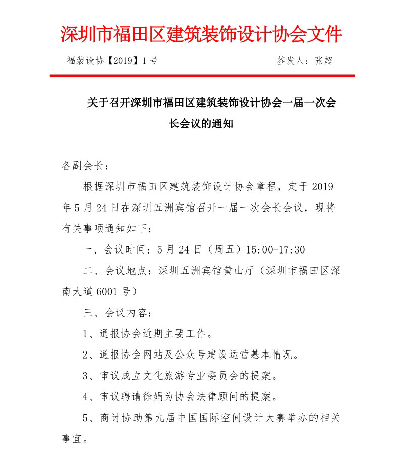 關(guān)于召開(kāi)深圳市福田區(qū)建筑裝飾設(shè)計(jì)協(xié)會(huì)一屆一次會(huì)長(zhǎng)會(huì)議的通知