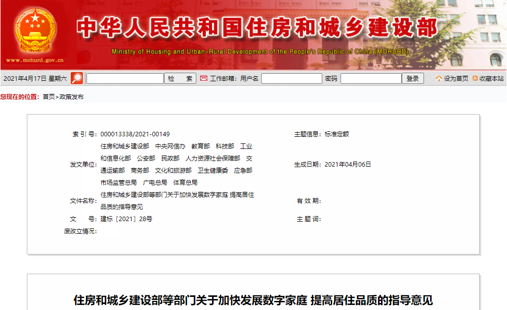4月16日,住房和城鄉建設部、中央網信辦、公安部等多部門聯合印發《關于加快發展數字家庭 提高居住品質的指導意見》(以下簡稱“意見”),就加快發展數字家庭、提高居住品質、改善人居環境提出4方面15項意見,要求到2022年底,數字家庭相關政策制度和標準基本健全,基礎條件較好的?。▍^、市)至少有一個城市或市轄區開展數字家庭建設,基本形成可復制可推廣的經驗和生活服務模式。到2025年底,構建比較完備的數字家庭標準體系;新建全裝修住宅和社區配套設施,全面具備通信連接能力,擁有必要的智能產品;既有住宅和社區配套設施,擁有一定的智能產品,數字化改造初見成效;初步形成房地產開發、產品研發生產、運營服務等有序發展的數字家庭產業生態;健康、教育、娛樂、醫療、健身、智慧廣電及其他數字家庭生活服務系統較為完善。