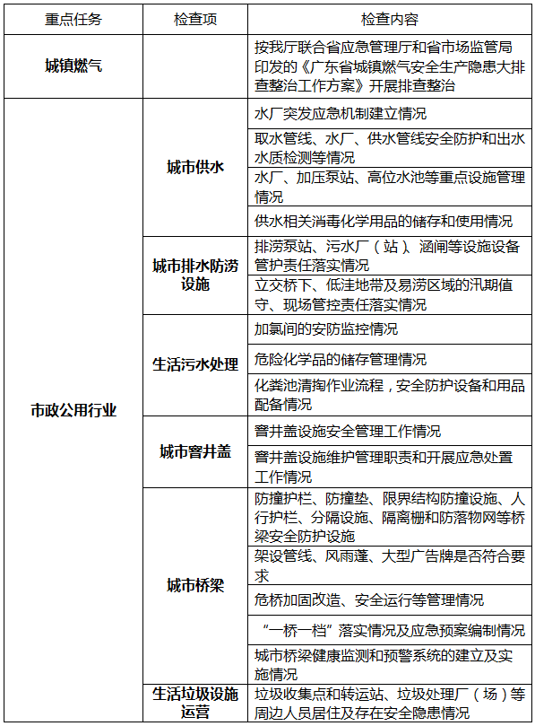 (二)全面深入排查整治市政公用行業安全隱患。結合《廣東省加強城市地下市政基礎設施建設工作方案》工作部署,重點對城市橋梁、供水、排水防澇設施、生活污水處理、生活垃圾設施運營、建筑垃圾處置、城市公園、窨井蓋管理以及有限空間作業管理等領域存在的安全隱患開展排查整治。