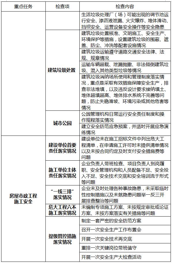 (三)從嚴從細排查整治房屋市政工程施工安全隱患。一是檢查參建單位安全生產履職行為。圍繞參建單位在建立健全安全生產責任制、開展安全風險管控和隱患排查治理、安全專項施工方案管理以及提級管控措施實施、風險主動報告制度落實等方面存在的問題,組織開展整改;二是檢查建筑工地現場實體情況。重點對建筑起重機械、深基坑、高支模等危大工程和城市軌道交通工程等關鍵環節安全隱患開展排查整治。