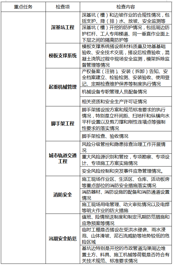重點對建筑起重機械、深基坑、高支模等危大工程和城市軌道交通工程等關鍵環節安全隱患開展排查整治。