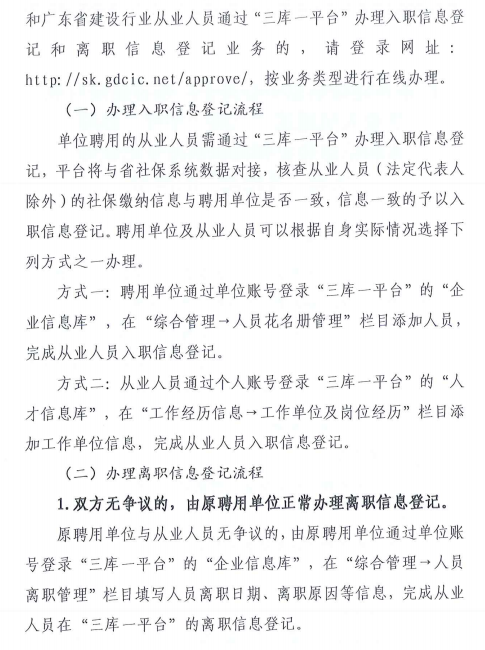 近日,廣東省三庫一平臺管理信息服務(wù)系統(tǒng)發(fā)布了關(guān)于廣東省建設(shè)行業(yè)從業(yè)人員通過“三庫一平臺”辦理入職信息登記和離職信息登記業(yè)務(wù)實施“零跑動”的通知,2021年8月10日起實施。通知明確: