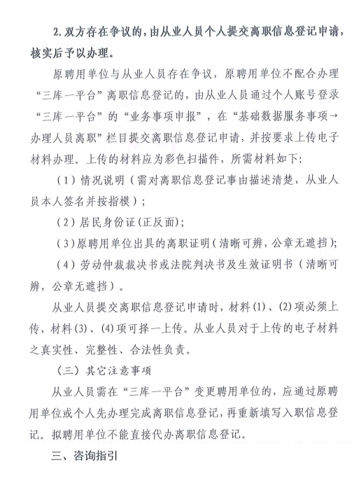 原聘用單位與從業(yè)人員存在爭議,原聘用單位不配合辦理“三庫一平臺”離職信息登記的,由從業(yè)人員通過個人賬號登錄"三庫一平臺”的“業(yè)務(wù)事項申報",在"基礎(chǔ)數(shù)據(jù)服務(wù)事項-辦理人員離職”欄目提交離職信息登記申請,并按要求上傳電子材料辦理。上傳的材料應(yīng)為彩色掃描件,所需材料如下: