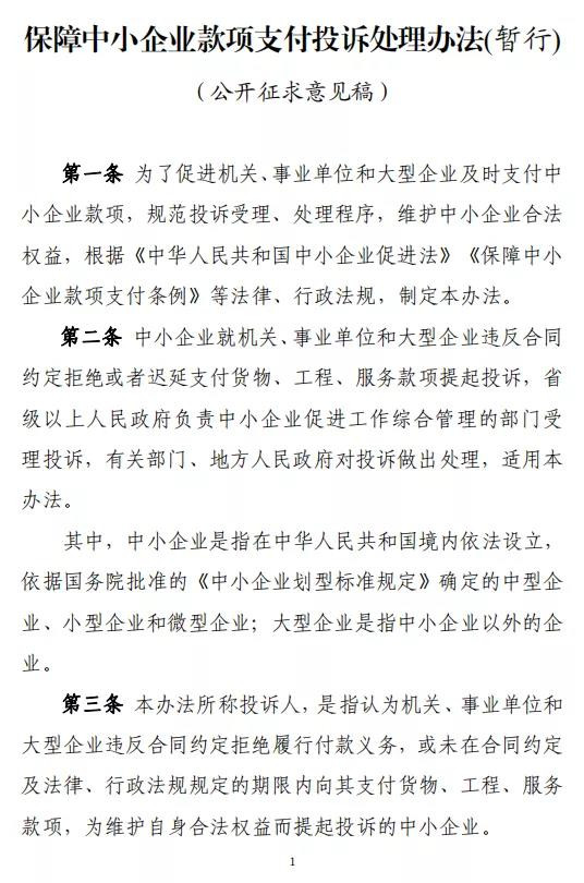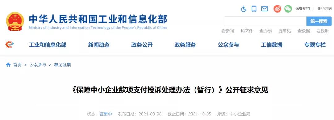 為進(jìn)一步貫徹落實(shí)《中小企業(yè)促進(jìn)法》和《保障中小企業(yè)款項(xiàng)支付條例》要求,切實(shí)保障中小企業(yè)合法權(quán)益,工業(yè)和信息化部中小企業(yè)局組織起草《保障中小企業(yè)款項(xiàng)支付投訴處理辦法(暫行)》(征求意見(jiàn)稿),公開(kāi)征求社會(huì)各界意見(jiàn),意見(jiàn)征求截止日期為2021年10月5日。