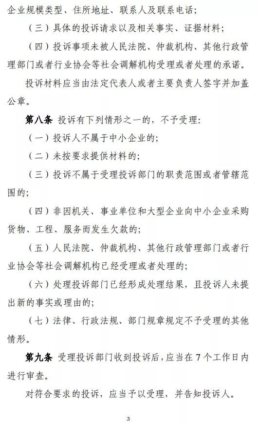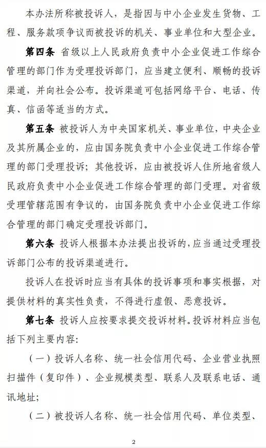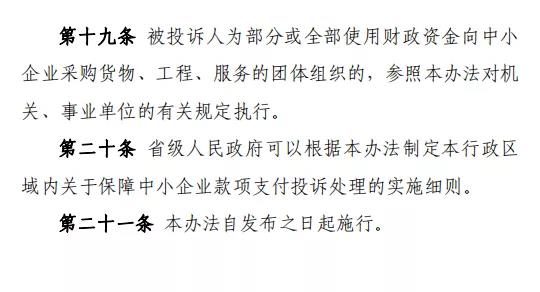 中小企業(yè)就機(jī)關(guān)、事業(yè)單位和大型企業(yè)違反合同約定拒絕或者遲延支付貨物、工程、服務(wù)款項(xiàng)提起投訴,省級(jí)以上人民政府負(fù)責(zé)中小企業(yè)促進(jìn)工作綜合管理的部門(mén)受理投訴,有關(guān)部門(mén)、地方人民政府對(duì)投訴做出處理,適用本辦法。