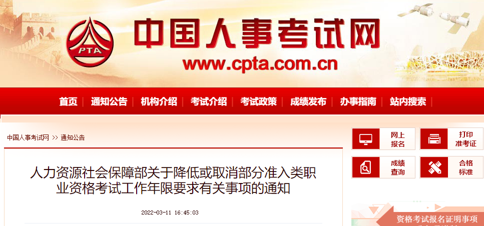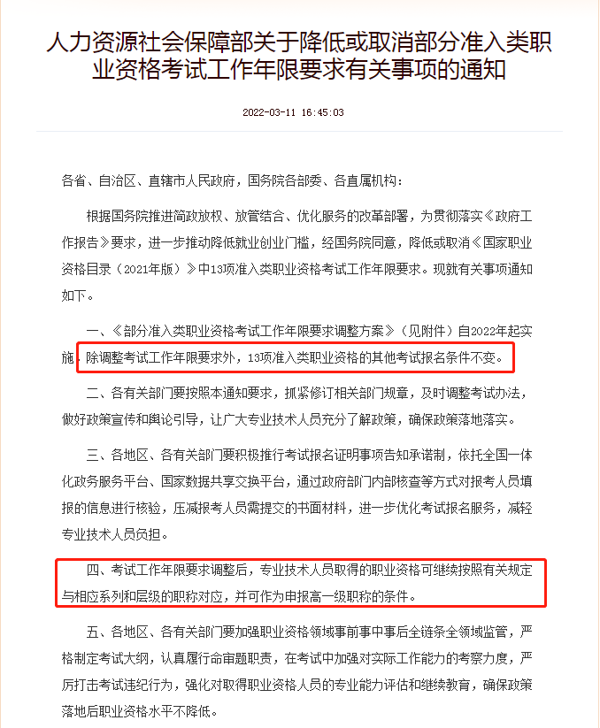 一、《部分準入類職業資格考試工作年限要求調整方案》(見附件)自2022年起實施。除調整考試工作年限要求外,13項準入類職業資格的其他考試報名條件不變。