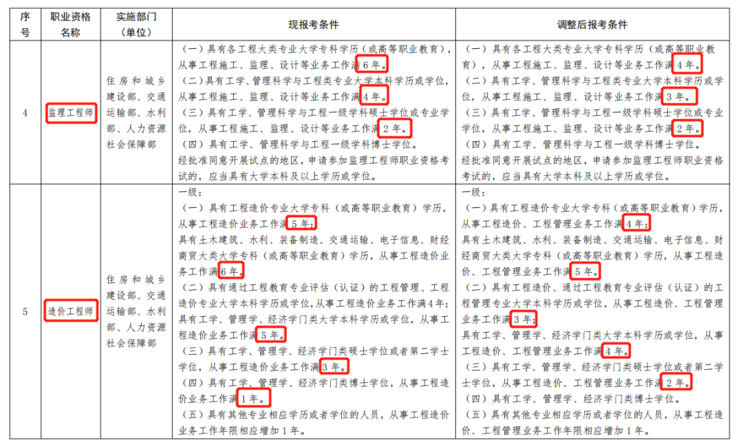 3月11日,中國人事考試網發布了《人力資源社會保障部關于降低或取消部分準入類職業資格考試工作年限要求有關事項的通知》,通知中提到降低或取消《國家職業資格目錄(2021年版)》中13項準入類職業資格考試工作年限要求。其中包括建造師(一級)、造價工程師、監理工程師、注冊安全工程師(中級)等。