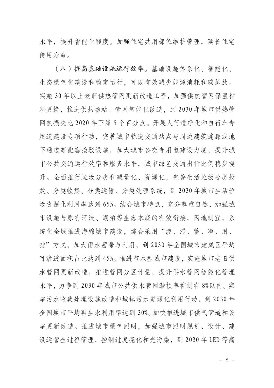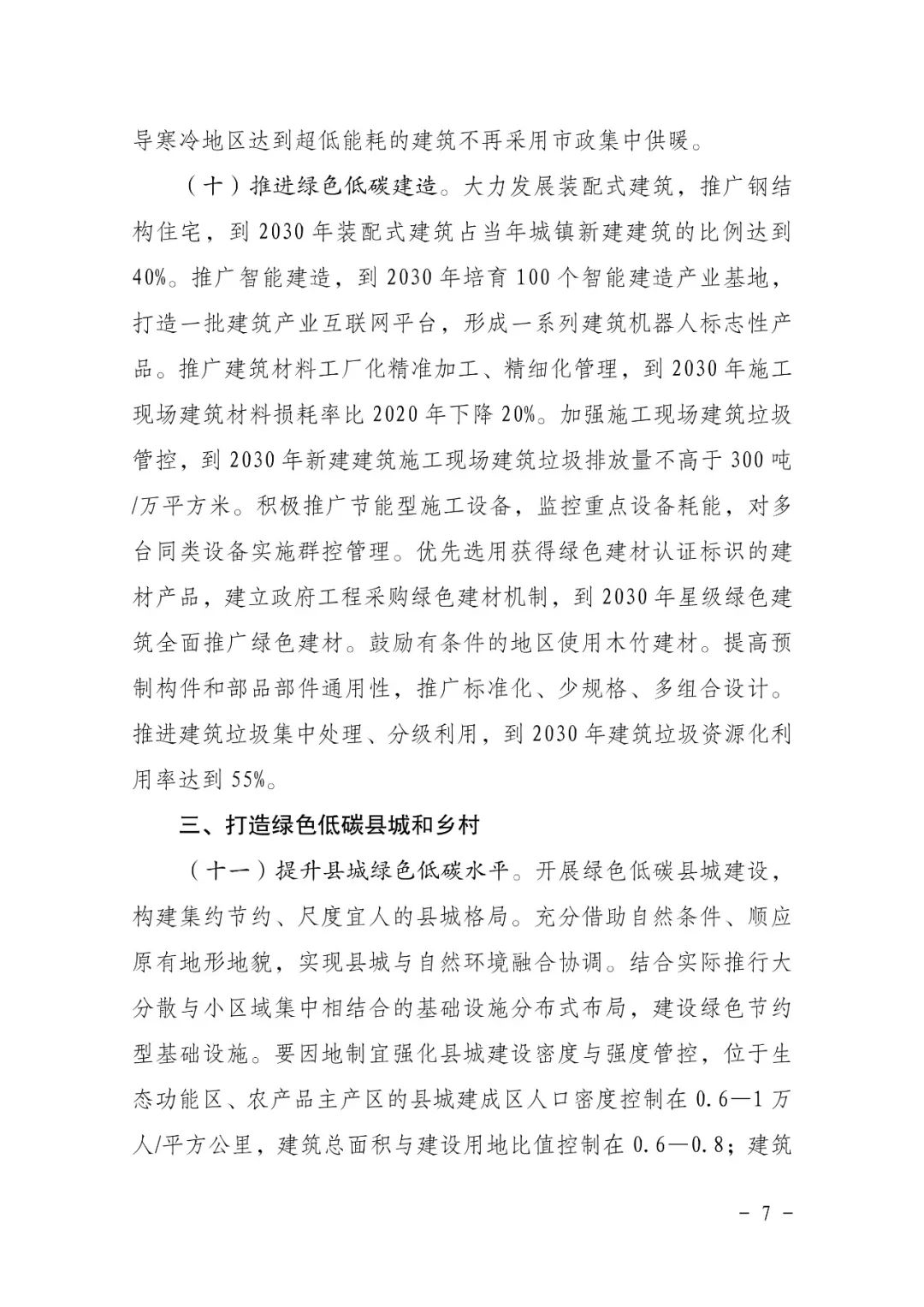 三、推進綠色低碳建造。大力發展裝配式建筑,推廣鋼結構住宅,到 2030 年裝配式建筑占當年城鎮新建建筑的比例達到40%。推廣智能建造,到 2030 年培育100個智能建造產業基地,打造一批建筑產業互聯網平臺,形成一系列建筑機器人標志性產品。推廣建筑材料工廠化精準加工、精細化管理,到2030年施工現場建筑材料損耗率比2020年下降20%。加強施工現場建筑垃圾管控,到 2030年新建建筑施工現場建筑垃圾排放量不高于300噸/萬平方米。積極推廣節能型施工設備,監控重點設備耗能,對多臺同類設備實施群控管理。優先選用獲得綠色建材認證標識的建材產品,建立政府工程采購綠色建材機制,到2030年星級綠色建筑全面推廣綠色建材。鼓勵有條件的地區使用木竹建材。提高預制構件和部品部件通用性,推廣標準化、少規格、多組合設計。推進建筑垃圾集中處理、分級利用,到2030年建筑垃圾資源化利用率達到55%。