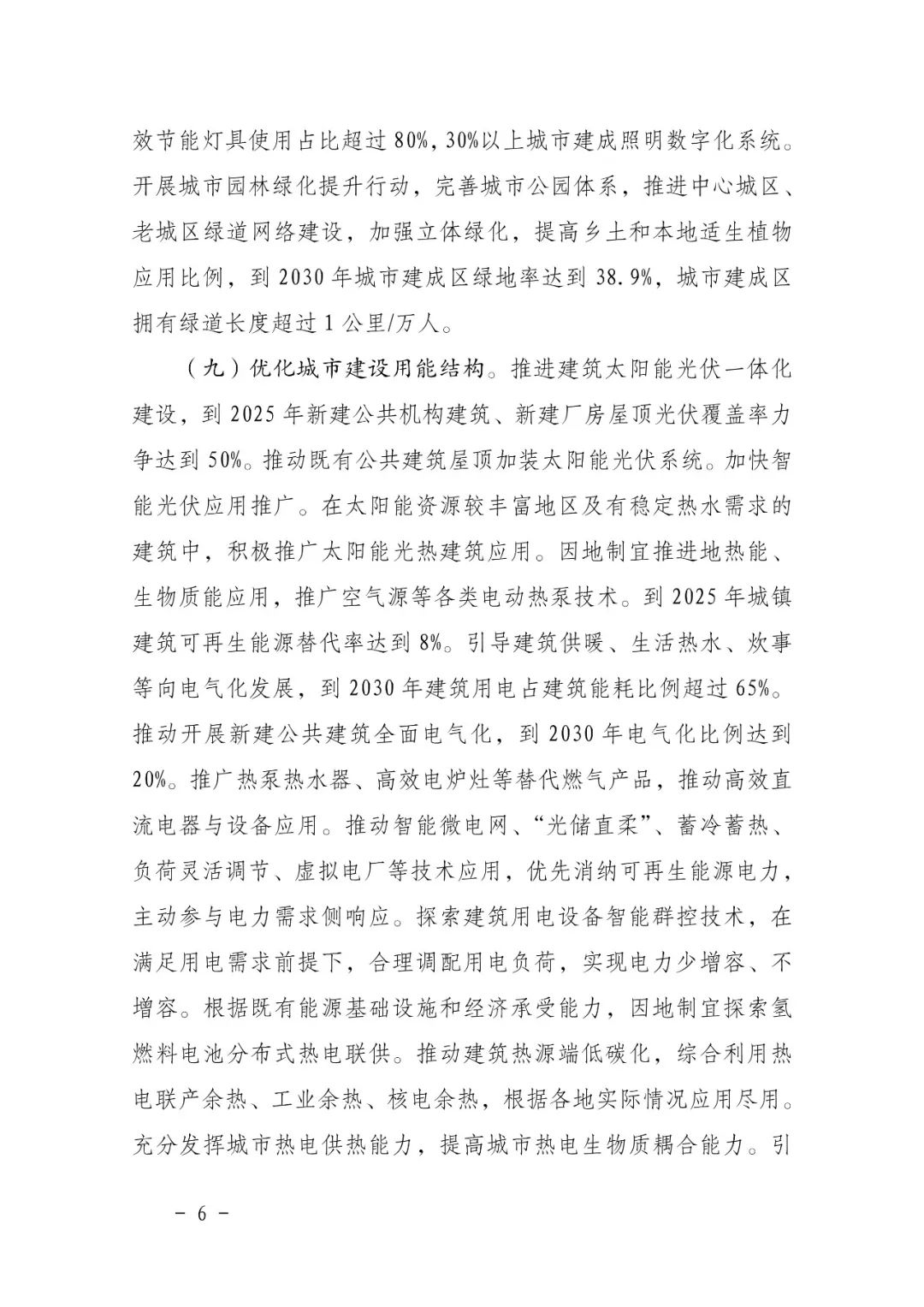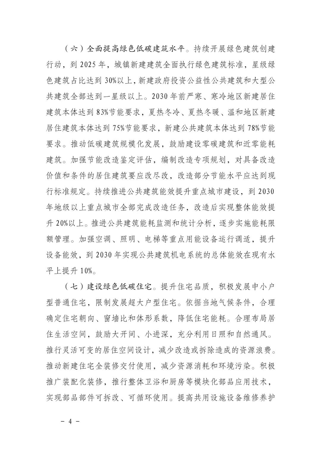 二、全面提高綠色低碳建筑水平。持續開展綠色建筑創建行動,到2025年,城鎮新建建筑全面執行綠色建筑標準,星級綠色建筑占比達到 30%以上,新建政府投資公益性公共建筑和大型公共建筑全部達到一星級以上。2030 年前嚴寒、寒冷地區新建居住建筑本體達到 83%節能要求,夏熱冬冷、夏熱冬暖、溫和地區新建居住建筑本體達到 75%節能要求,新建公共建筑本體達到78%節能要求。推動低碳建筑規模化發展,鼓勵建設零碳建筑和近零能耗建筑。加強節能改造鑒定評估,編制改造專項規劃,對具備改造價值和條件的居住建筑要應改盡改,改造部分節能水平應達到現行標準規定。持續推進公共建筑能效提升重點城市建設,到2030年地級以上重點城市全部完成改造任務,改造后實現整體能效提升20%以上。推進公共建筑能耗監測和統計分析,逐步實施能耗限額管理。加強空調、照明、電梯等重點用能設備運行調適,提升設備能效,到2030年實現公共建筑機電系統的總體能效在現有水平上提升10%。