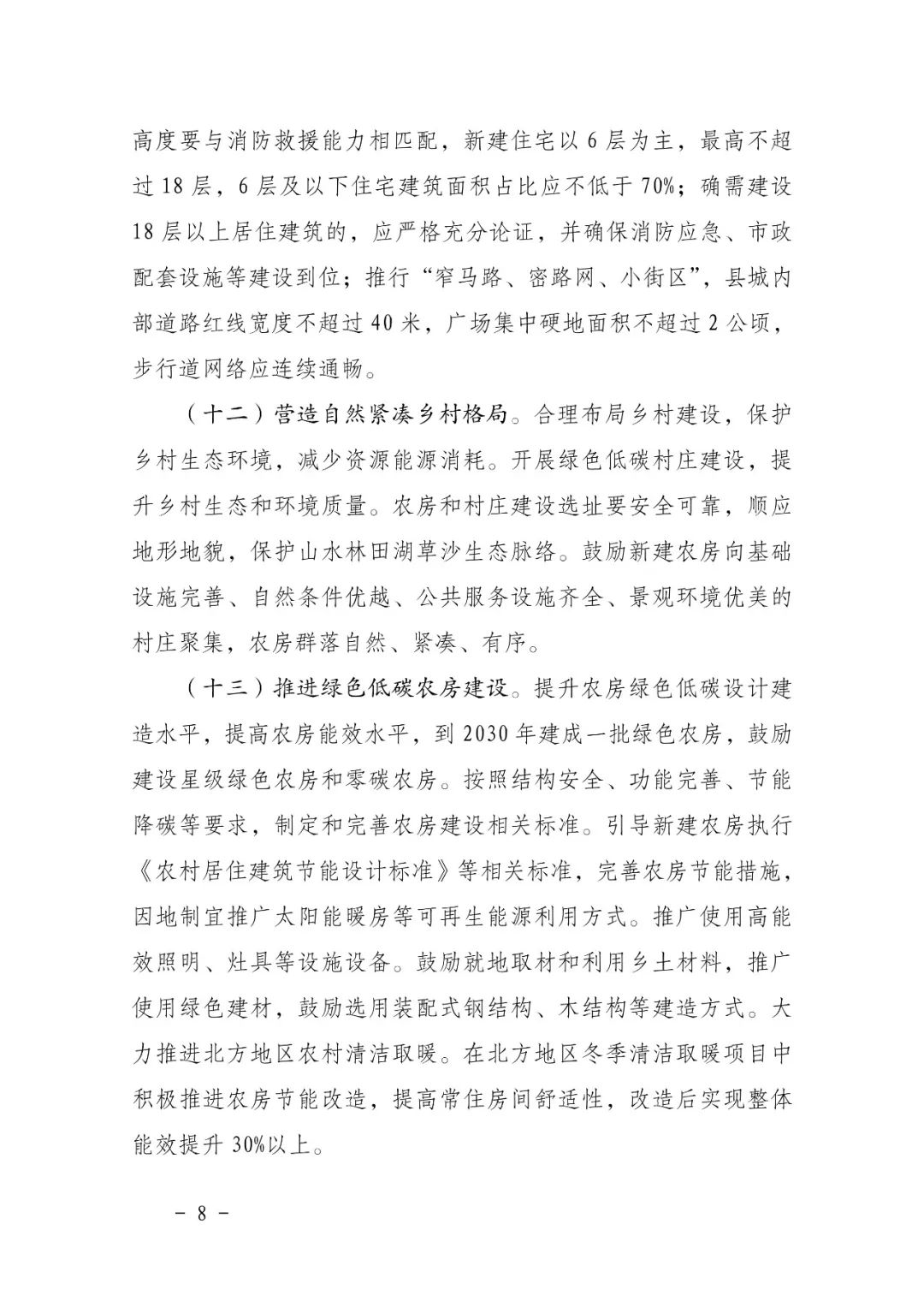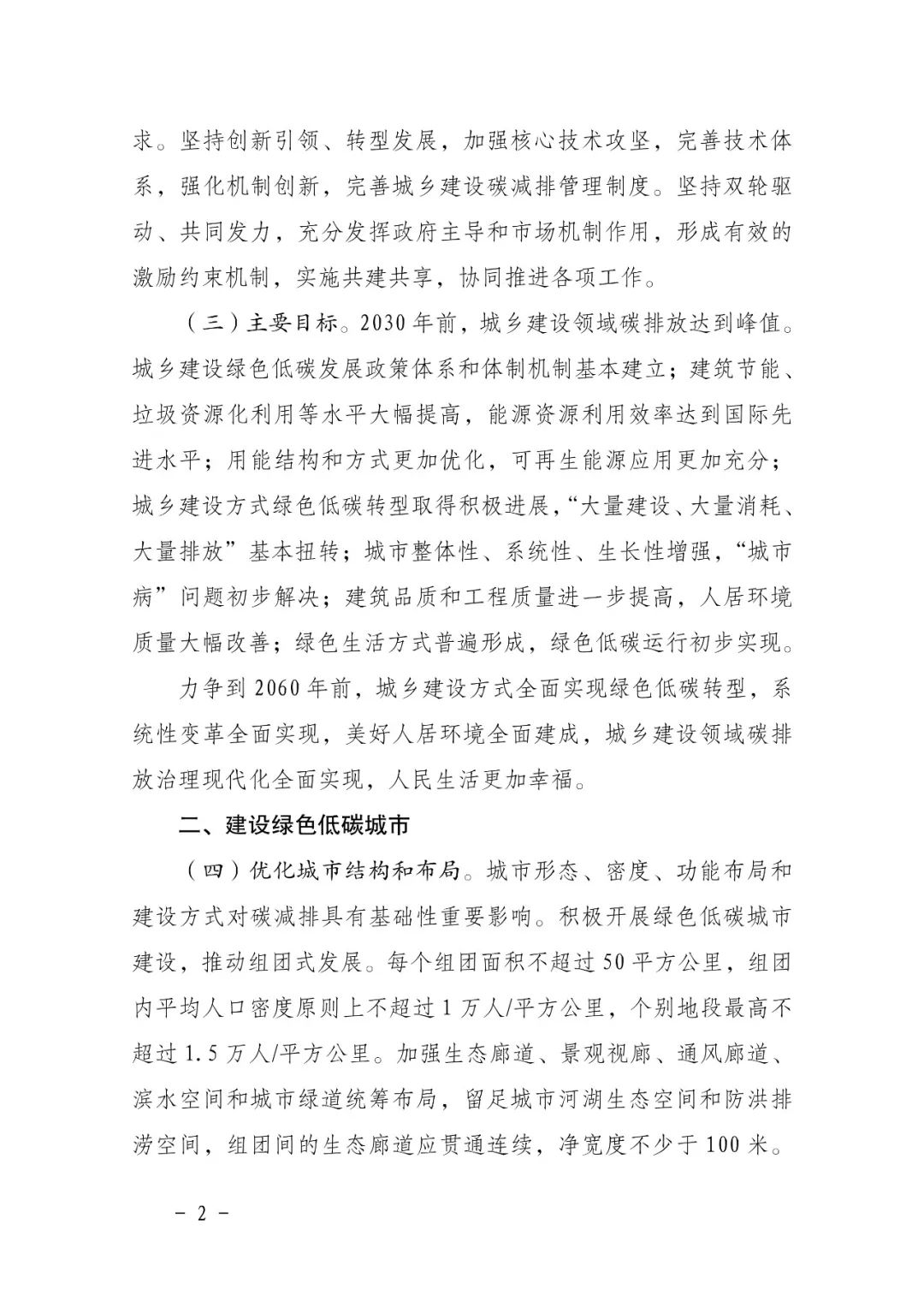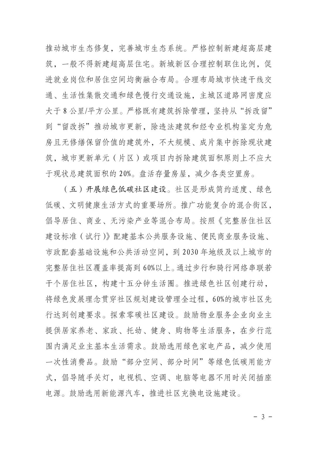 一、優化城市結構和布局。城市形態、密度、功能布局和建設方式對碳減排具有基礎性重要影響。積極開展綠色低碳城市建設,推動組團式發展。每個組團面積不超過 50 平方公里,組團內平均人口密度原則上不超過 1 萬人/平方公里,個別地段最高不超過 1.5 萬人/平方公里。嚴格控制新建超高層建筑,一般不得新建超高層住宅。新城新區合理控制職住比例,促進就業崗位和居住空間均衡融合布局。合理布局城市快速干線交通、生活性集散交通和綠色慢行交通設施,主城區道路網密度應大于 8 公里/平方公里。嚴格既有建筑拆除管理,堅持從“拆改留”到“留改拆”推動城市更新,除違法建筑和經專業機構鑒定為危房且無修繕保留價值的建筑外,不大規模、成片集中拆除現狀建筑,城市更新單元(片區)或項目內拆除建筑面積原則上不應大于現狀總建筑面積的 20%。盤活存量房屋,減少各類空置房。