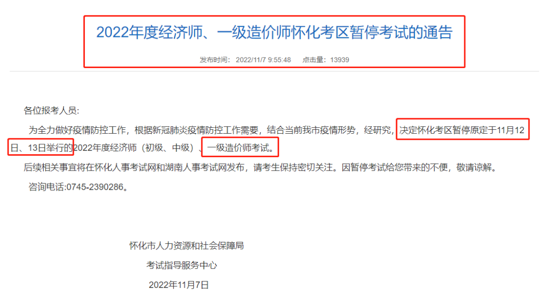 11月7日,湖南懷化和邵陽通知:暫停原定于11月12日、13日舉行的一級造價師考試。