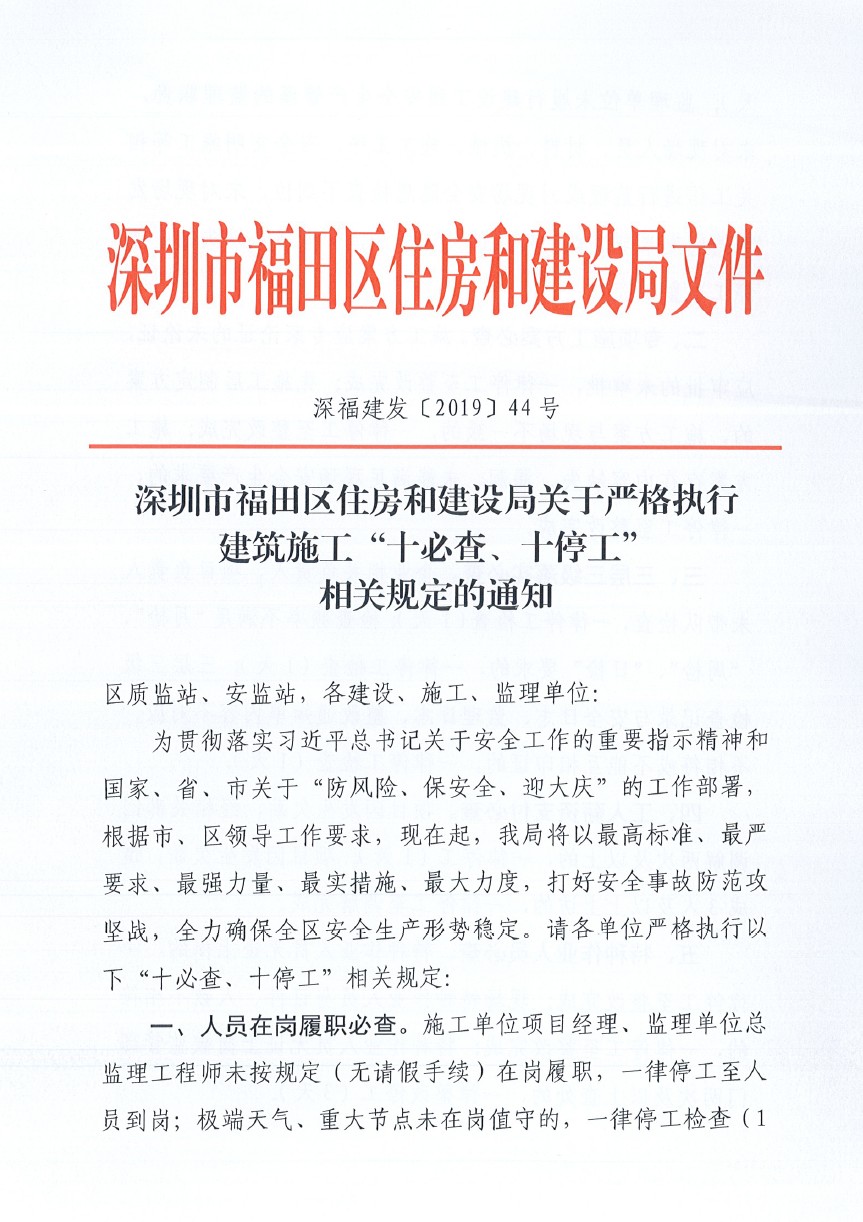 深圳市福田區住房和建設局發布關于嚴格執行建筑施工“十必查、十停工”相關規定的通知