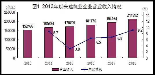 2018年,全國建筑業企業實現營業收入211992億元,首次突破20萬億元,達到歷史最高水平。其中,主營業務收入209339億元,比2013年增長38.5%,年均增長6.7%。