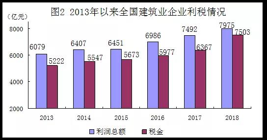 2018年,全國建筑業企業實現利潤總額7975億元,達到歷史最高水平,比2013年增長31.2%,年均增長5.6%;上繳稅金總額7503億元,增長43.7%,年均增長7.5%。全國建筑業企業實現利稅總額逐年增長,壯大了企業自身實力,為國家財政收入保持穩定增長作出了貢獻。